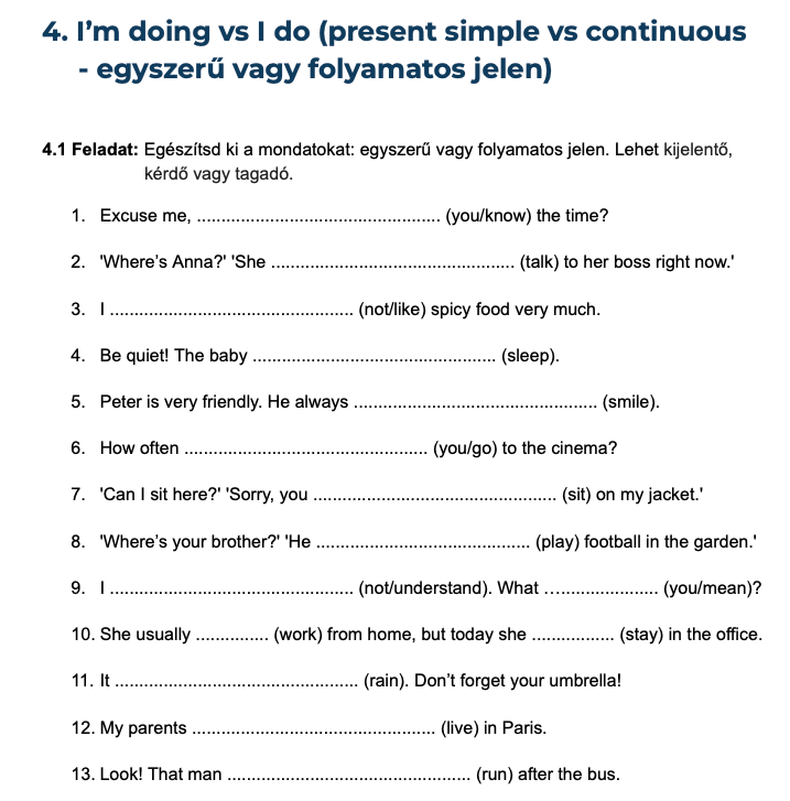 Angol nyelvtani gyakorlatok (A1–B1 szint)